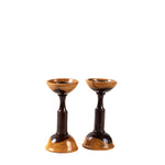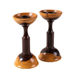 Warm, rich, and full of character this set of hand-turned wood candle holders features a striking mix of dark and golden tones, showcasing the natural grain of the wood. Their sleek silhouette adds height and organic beauty to a styled shelf, mantel, or dinner table.