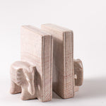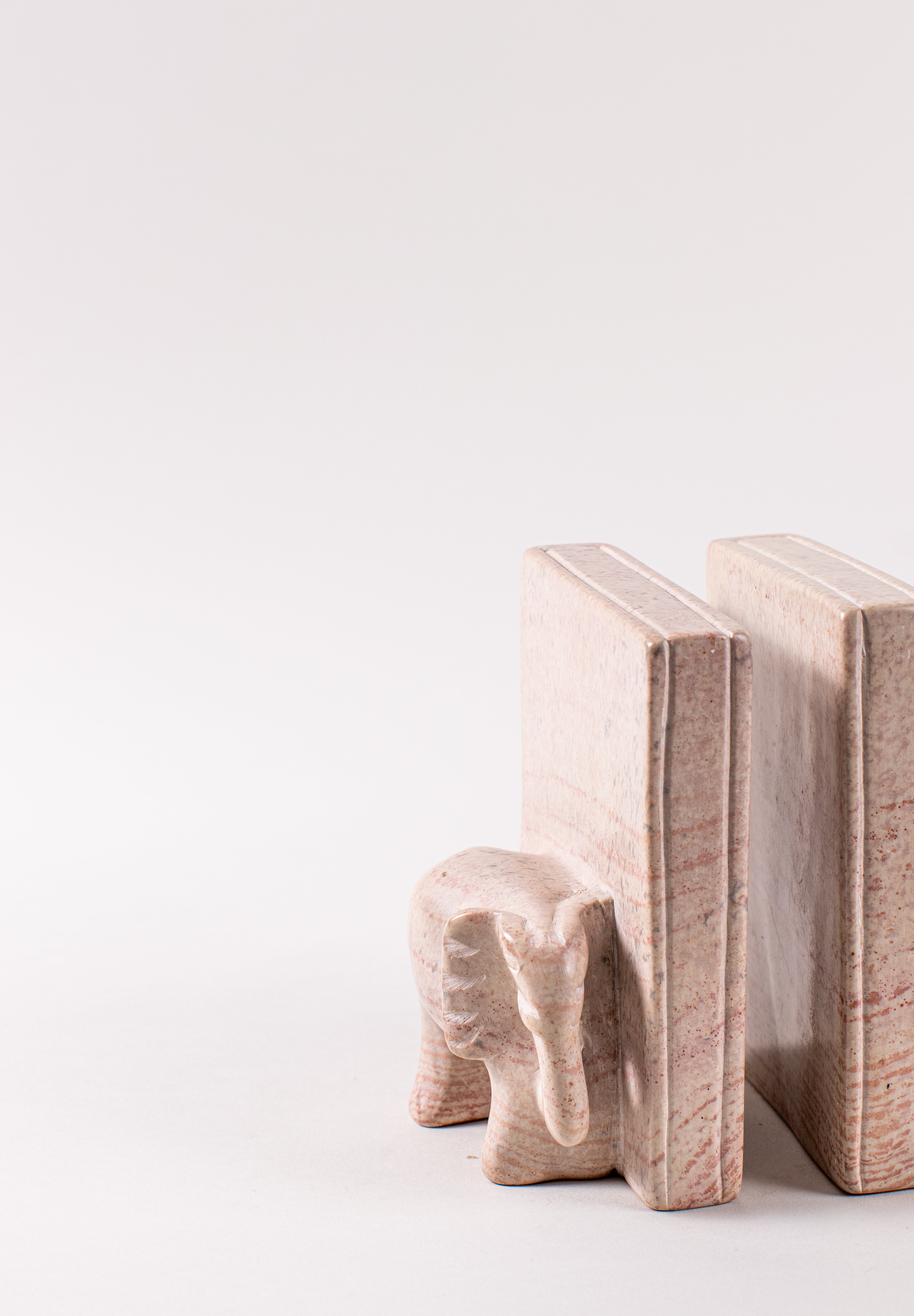 Bring a touch of artisan charm to your bookshelf with this pair of hand-carved elephant bookends from Kenya. Crafted from natural pink-toned Kisii stone, each piece is uniquely veined and shaped by local artisans using traditional methods passed down through generations. The elephants represent strength and wisdom — a fitting symbol to guard your favorite reads. Perfect for styling shelves, desks, or consoles with global warmth and grounding texture.